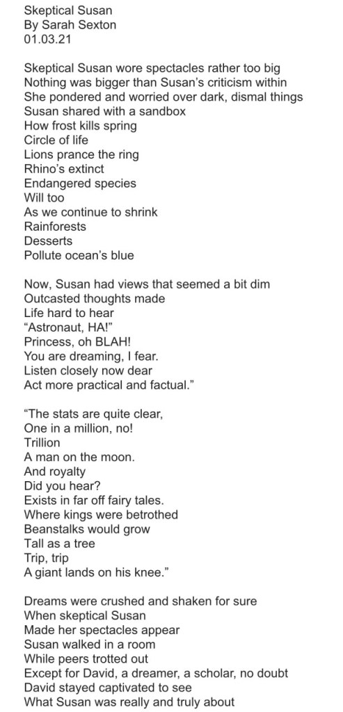 Posted on February 1, 2021February 1, 2021 by abbeyrow10Skeptical Susan For every down there is an up, for every sad there is a glad, and for everybody there is a friend. Skeptical Susan By Sarah Sexton 01.03.21 Share this: Click to share on X (Opens in new window) X Click to share on Facebook (Opens in new window) Facebook Like Loading... Related