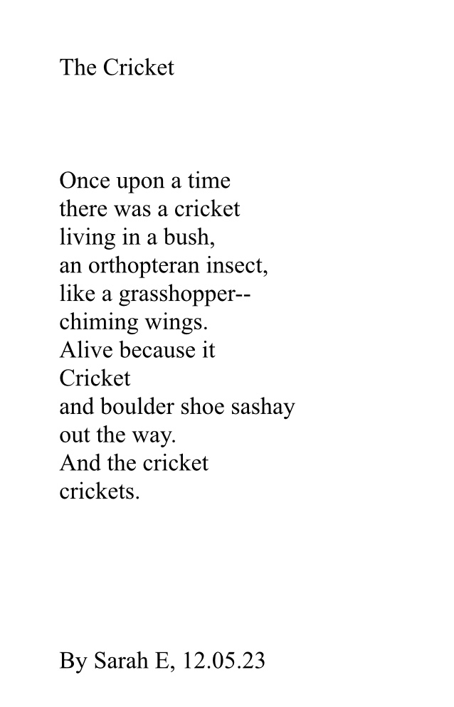 Essentially, The Cricket is a survival story, not from Girl Scout camp, but the pounding footsteps upon us. As always, this was a fresh write and needs years of editing. I hope you enjoy.