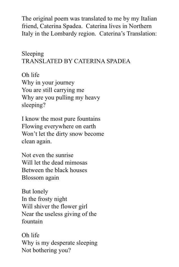 The original poem was written by a young Italian woman, age 18 who lost her life too soon. It was a beautiful honor to reimage this poem and work with my dear friend, Caterina on the translation. Please read if you are able and enjoy.